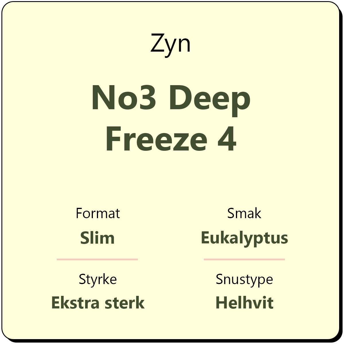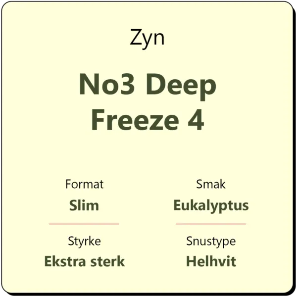 Zyn No3 Deep Freeze 4 er en hvit snus i hvite slim porsjonsposer med smak av eukalyptus og mentol. Med et nikotininnhold på 15,7 mg/g er dette klassifisert som en ekstra sterk snus, tilsvarende styrkegrad 4 eller S4 ifølge Zyn. Bokser inneholder ca. 22 helhvite porsjoner.