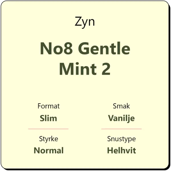 Zyn No8 Gentle Mint 2 er en helhvit snus med en mild smak av vanilje og mint. Med et nikotininnhold på 9,3 mg/g er dette klassifisert som en normalt sterk snus, tilsvarende styrkegrad 2 ifølge Zyn. Bokser inneholder ca. 22 helhvite porsjoner.